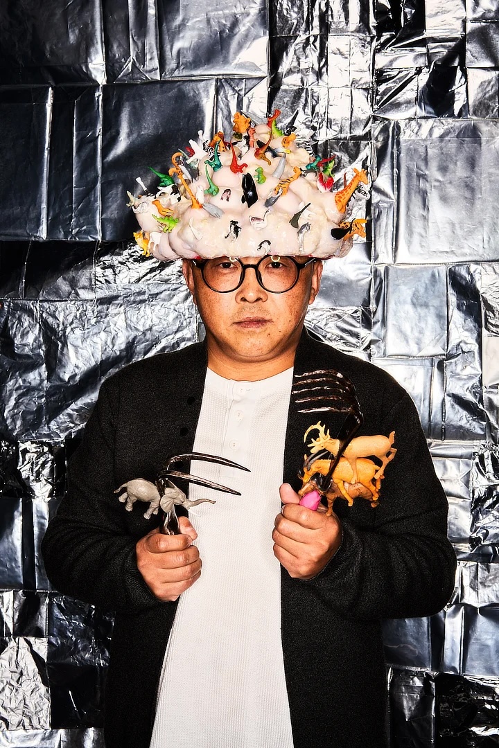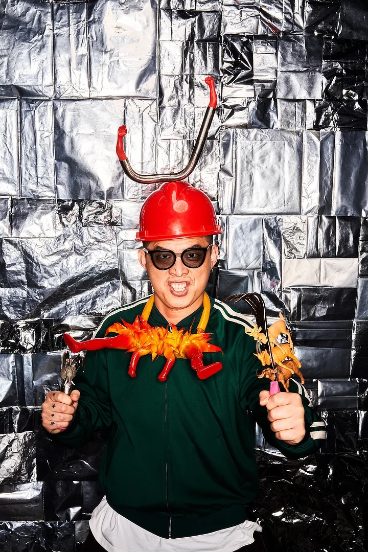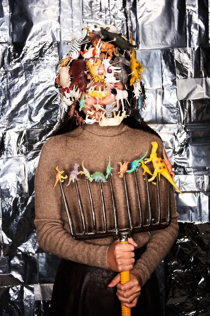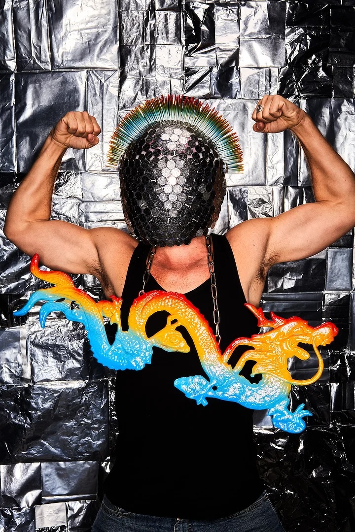 La camionnette JinLong est stationnée. Une grande boite noire en tissu est déployée. Un fond en patchwork d’emballages argentés est installé et des flashs sont mis en place. Les sculptures sont à disposition sur une table devant le studio itinérant. Les gens approchent, choisissent des objets. La prise de vue commence. On joue le jeu et on repart avec un tirage papier de son portrait.