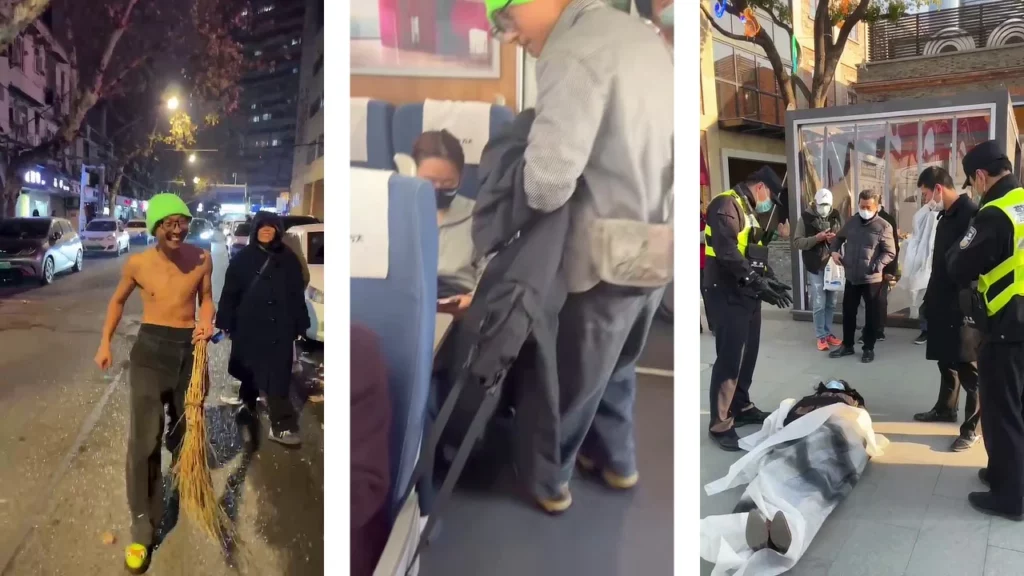 Quand nous avons connu Lyu Desheng il dessinait tout le temps, mais déjà tout le temps sur son smartphone, empilant smiley sur smiley dans des animations frénétiques aux couleurs acidulées. Il est désormais le plus souvent en vadrouille à éprouver les limites de la confrontation poétique aux bonnes manières. Qu’il essaye vainement de franchir un passage piéton retenu à un feu rouge par une bande de sécurité élastique, qu’il balaye une rue torse nu en plein hiver, qu’il accroche systématiquement la bandoulière de son sac aux accoudoirs des sièges en marchant dans le couloir d’un train, qu’il se rase la tête à l’exception d’un triangle au sommet du crâne, qu’il négocie avec la police alors qu’une amie reste obstinément allongée au milieu d’un trottoir, Lyu Desheng est toujours rieur et n’a jamais peur de rien.