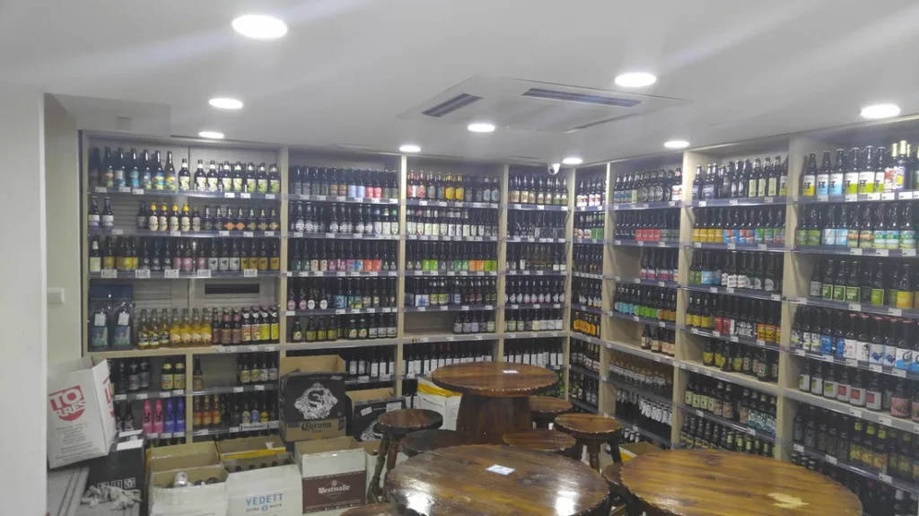 Un jour en attendant que la photocopieuse se ranime nous avons remarqué qu’il y avait un bon choix de bières différentes, au milieu du fouillis des milles produits d’une épicerie de quartier. Quelques mois plus tard le choix avait encore augmenté et nous remarquions qu’une petite table ronde et trois tabourets en bois vernis dans un style pseudo rustique avaient remplacé un rayonnage de produits ménagers. Une autre fois nous constations que la variété des bières disponibles devenait vraiment très étonnante.