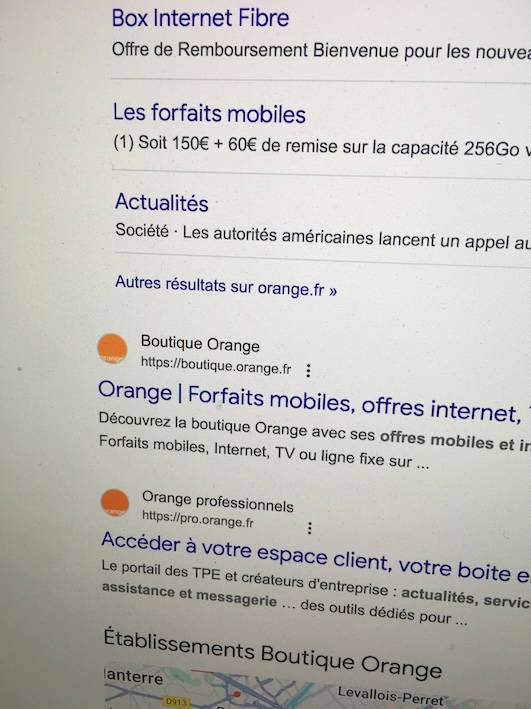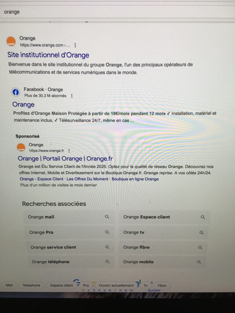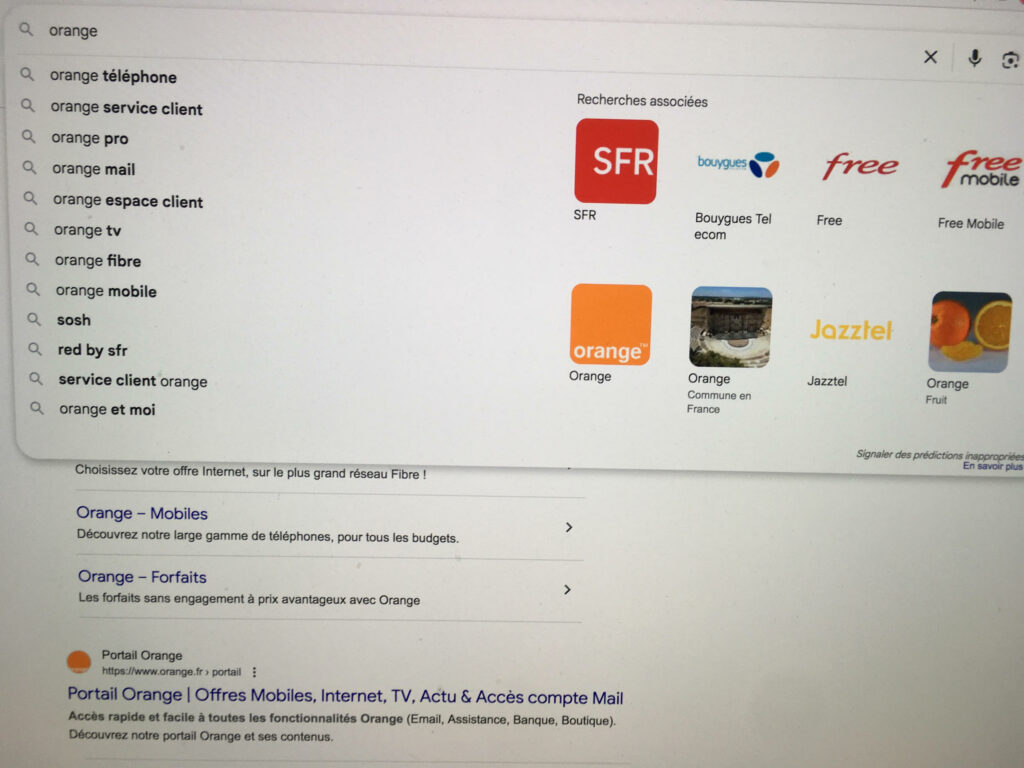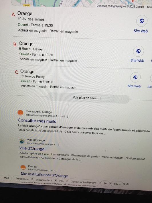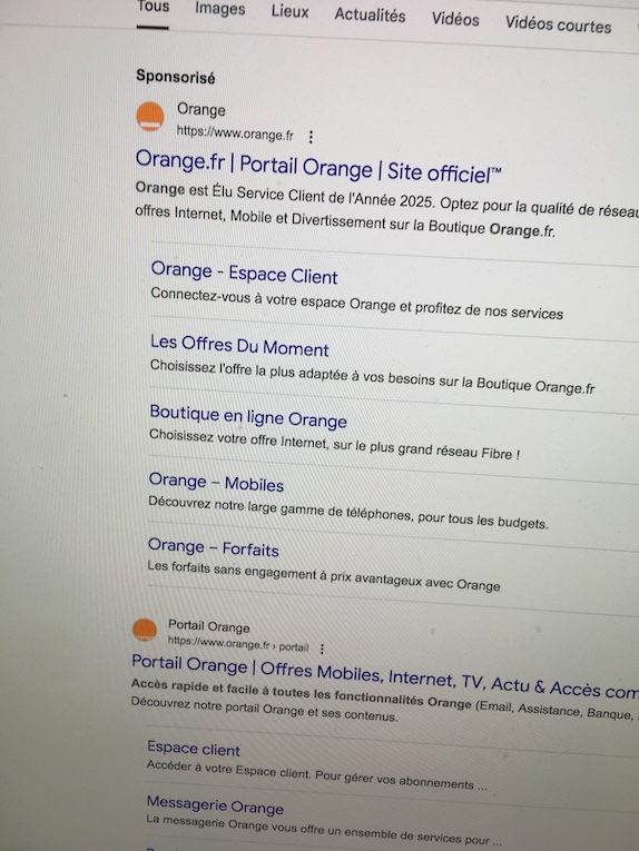 J’ai tapé : orange. Bien mal m’en a pris. Vous qui entrez ici, et cetera. Lien sponsorisé : Orange.fr / Portail Orange / Site officiel™ Je ne vais pas m’émouvoir pour si peu. On est en 2025, on paye pour paraître le premier, c’est bien marqué : « Sponsorisé ». C’est clair. C’est net. C’est bien. Tout au plus pourrait-on objecter que ça prend un peu de place : Orange-Espace client, Les Offres du Moment (avec majuscules), Boutique en ligne Orange, Orange-Mobiles, Orange-Forfaits, pas moins de cinq subdivisions mangeant une portion non négligeable de la plus généreuse hauteur d’écran. Le deuxième lien (principal) proposé n’est pas sponsorisé : Portail Orange / Offres Mobiles, Internet, TV, Actu & Accès, et cetera. On se demande pourquoi ils ont payé pour le premier puisque c’est le même, sauf les subdivisions, qui prennent aussi pas mal de place. Le troisième lien sur la page c’est : Boutique Orange. Le quatrième : Orange professionnels. Puis vient un plan (ça prend de la place) et trois adresses de (vraies) boutiques Orange (ça prend de la place). Le sixième lien à proprement parler c’est : messagerie Orange. Le septième : site institutionnel d’Orange (en gros, l’équivalent virtuel du siège social de l’entreprise). Lecteur attentif, qui peut-être a négligé l’injonction d’abandonner tout espoir au moment de me suivre, tu auras noté, avec un frisson d’anticipation, que j’ai pour l’heure passé sous silence le lien numéro cinq — se pourrait-il qu’il ne participe pas de la même série ? Cela se peut et c’est le cas. Il s’agit du site officiel de la municipalité d’Orange. Pas forcément votre ville préférée. Moi je ne la déteste pas car il se trouve qu’une personne que j’aime, et avec qui j’ai beaucoup écrit, à quatre mains comme on dit, y tient avec son mari — j’ignore si on tient un commerce à quatre mains ?— une librairie : L’Orange Bleue. Qu’on y ait ou non des attaches, la présence, virtuelle, sur la page, d’une véritable communauté humaine, fût-elle le terrain de jeu de toutes les nuances possibles de l’extrême droite, pourrait nous être un réconfort… Cela se pourrait, oui, si la page suivante de ma recherche Google, une fois ouverte, ne s’avérait pas encore plus exclusivement dédiée au constat de l’omniprésence algorithmique de la société Orange.