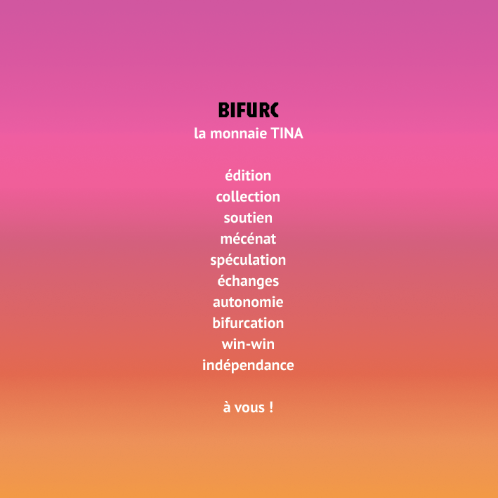TINA* est une revue d’idées, d’imaginaires et de critiques consacrée aux auteur.e.s et artistes qui prospectent, explorent, s’aventurent loin de la facilité commerciale et des répétitions. La revue TINA tente une expérience littéraire, politique, artistique, critique, bricologique, évolutive en format numérique gratuit (TINA online) et une fois par an en format papier payant (TINA papier), et chaque mois avec des évènements.